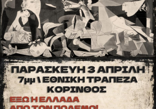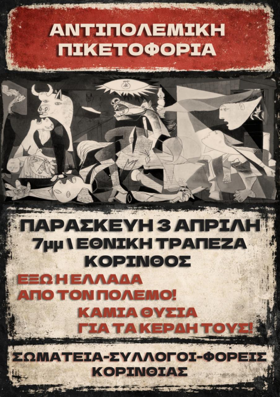 Οι εργαζόμενοι της Κορινθίας δίνουμε συνέχεια στην πάλη ενάντια στην εμπλοκή της χώρας μας στον πόλεμο, ενάντια στην πολεμική οικονομία που για μας σημαίνει ακρίβεια, εντατικοποίηση, καταστολή, χτύπημα των δικαιωμάτων μας! Ενάντια στη μετατροπή της χώρας μας σε στόχο αντιποίνων! Δε θα πληρώσουμε τα σπασμένα για τους ανταγωνισμούς των ιμπεριαλιστών! Δε δεχόμαστε την εμπλοκή της χώρας για τα κέρδη των μεγάλων αφεντικών που θησαυρίζουν από τις ματωμένες μπίζνες!