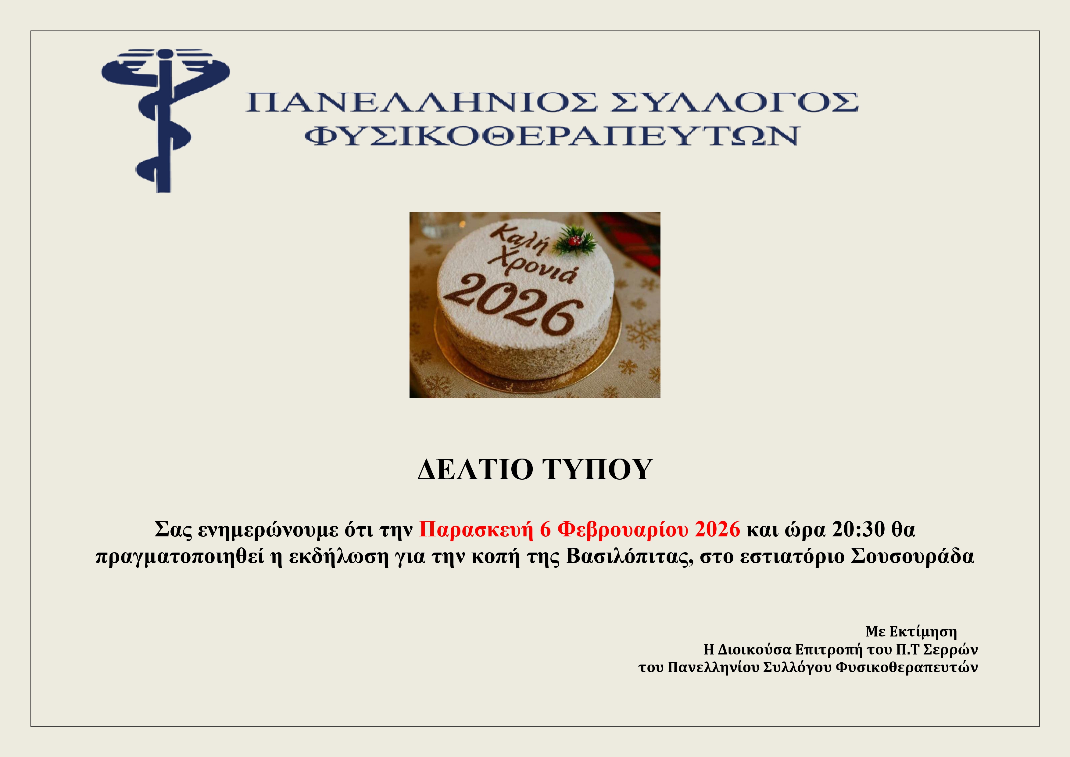 Σας ενημερώνουμε ότι την Παρασκευή 6 Φεβρουαρίου 2026 και ώρα 20:30 θα πραγματοποιηθεί η εκδήλωση για την κοπή της Βασιλόπιτας, του Περιφερειακού Τμήματος Σερρών του Πανελληνίου Συλλόγου Φυσικοθεραπευτών, στο εστιατόριο ΄΄Σουσουράδα΄΄ στην κοιλάδα